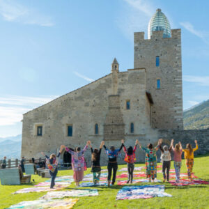 Demontage: Eine Woche nach Ende der Sommerausstellung auf Schloss Leuk nehmen, Esther, Leonie und Elisabeth den Turmzinnen ihre Hauben wieder ab. Das Wetter ist gut, windstill, herbstlich. Es geht problemlos, nichts hat sich, wie befürchtet verheddert. Die Decken haben bis zu drei Monate Wind, Wetter und Sonne Stand gehalten. Sie sind verfilzt, ausgebleicht, ab und zu ein durchgescheuertes Glozzji – aber ganz!
