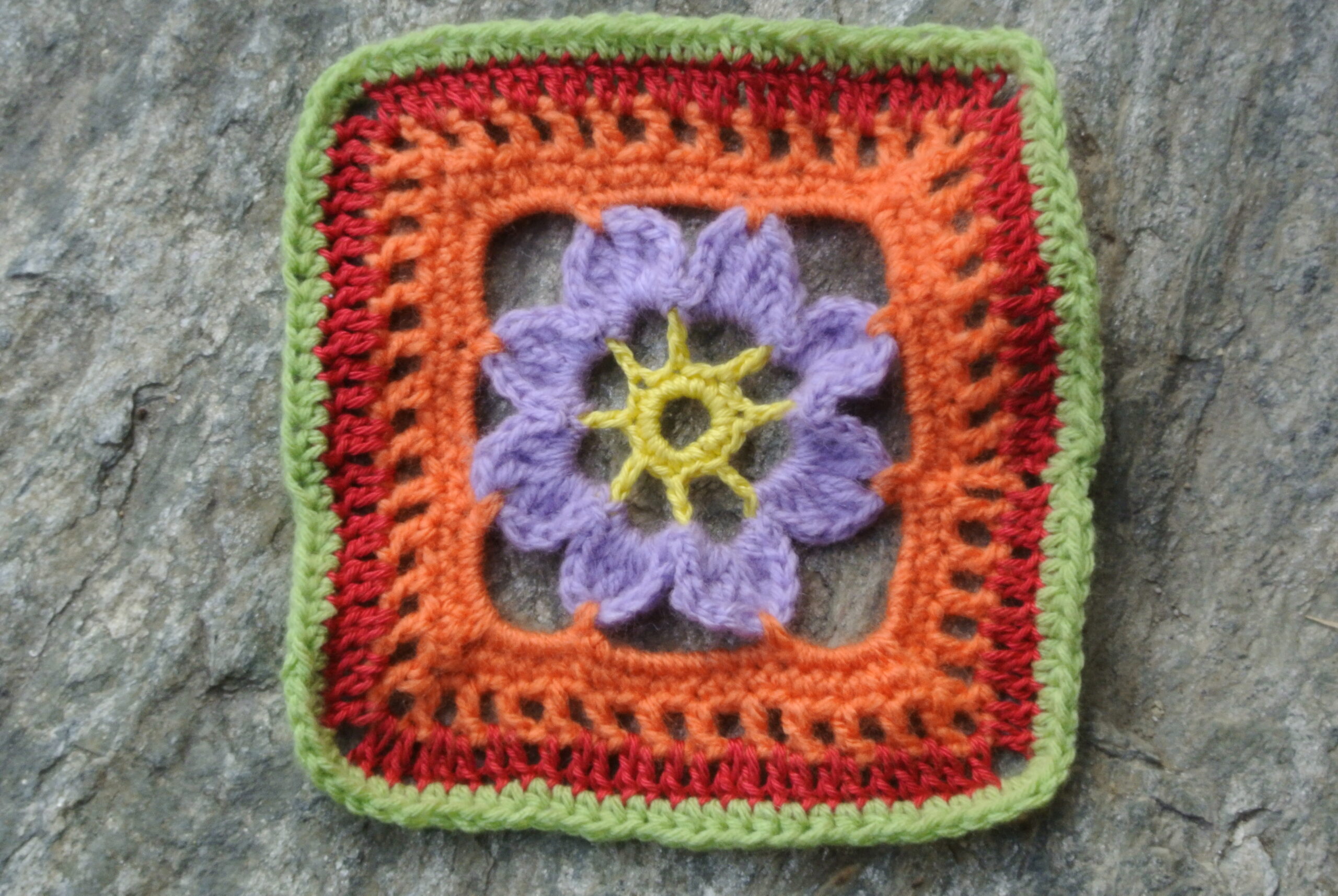 Mit dem neuen Jahr begannen auch meine Versuche mit den Glozzjinis. Ich hatte jahrelang nicht mehr gehäkelt. Als erstes musste ich die Häkelschrift entziffern lernen. Feste Masche: ok, Stäbchen: auch gut. Aber wie halbiert man denn ein Stäbchen? Wer sucht, der findet. In meinem Fall befanden sich die Antworten in der «Granny Square Bible» von Sarah Hazell. Meine erste «achtblättrige Blüte» hatte nur sechs Blätter, was mir erst auffiel, als ich diese ins Quadrat einhäkeln sollte. Doch schon bald musste ich immer weniger auf die Anleitung schielen, was die Sache vereinfachte und dann kam ich an den Punkt, an dem ich das Muster auswendig konnte. Seither macht mir das Glozzjini-Häkeln einfach nur Spass und meine Wollrestensammlung wird allmählich zu netten, bunten Blümchen im Quadrat verarbeitet.